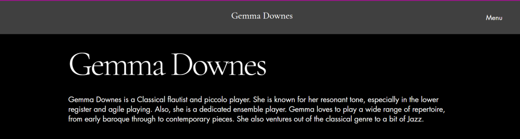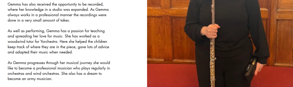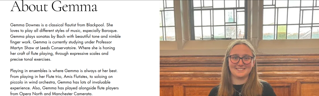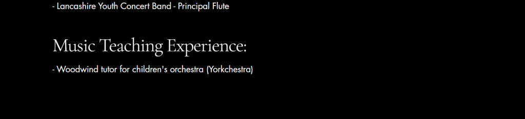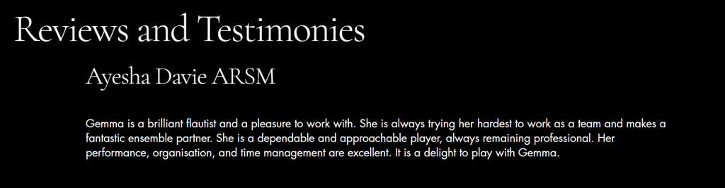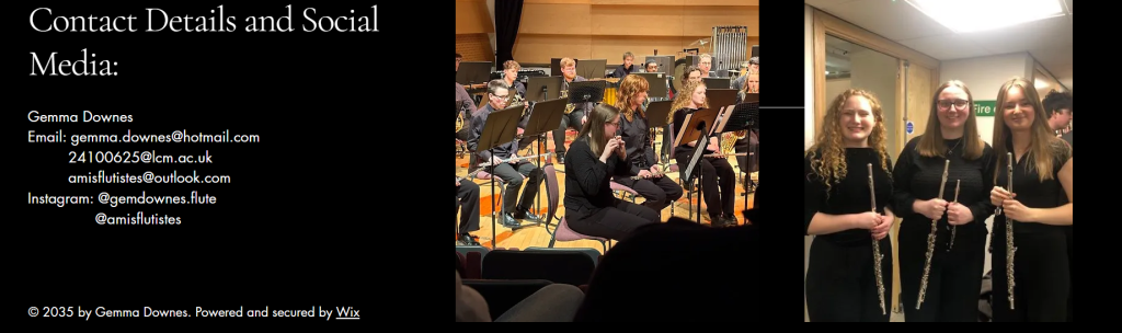 To create a professional aesthetic for my EPK I went with the colour theme of black and white. This suggests “simplicity and elegance; perfect for the professional image it’s trying to portray” (Stewart, 2024). Another decision I made was which photos I should use. As I didn’t have any professional pictures I used ones taken by my family where I looked smart wearing concert blacks and was holding my flute. I also play piano and oboe but I chose not to include these in my EPK as there are not many jobs that would require you to play this combination of instruments. This is why I chose to just focus on flute as that is what jobs I want offers from. Another decision that was made to create a professional aesthetic was the naming of the flute trio I am in. We wanted a name that reflected us as friendly and approachable, but also professional. Our original name was Flute Friends, but we decided that this did not sound professional so we translated it into french to get Amis Flutistes . We chose French as we play lots of French repertoire.